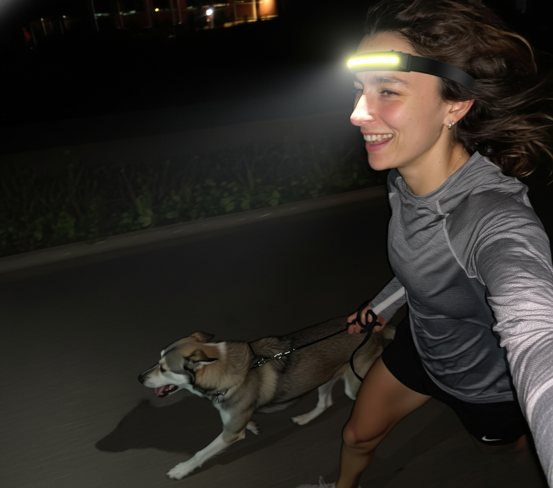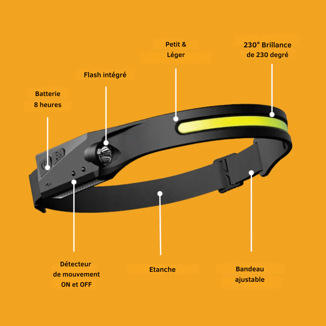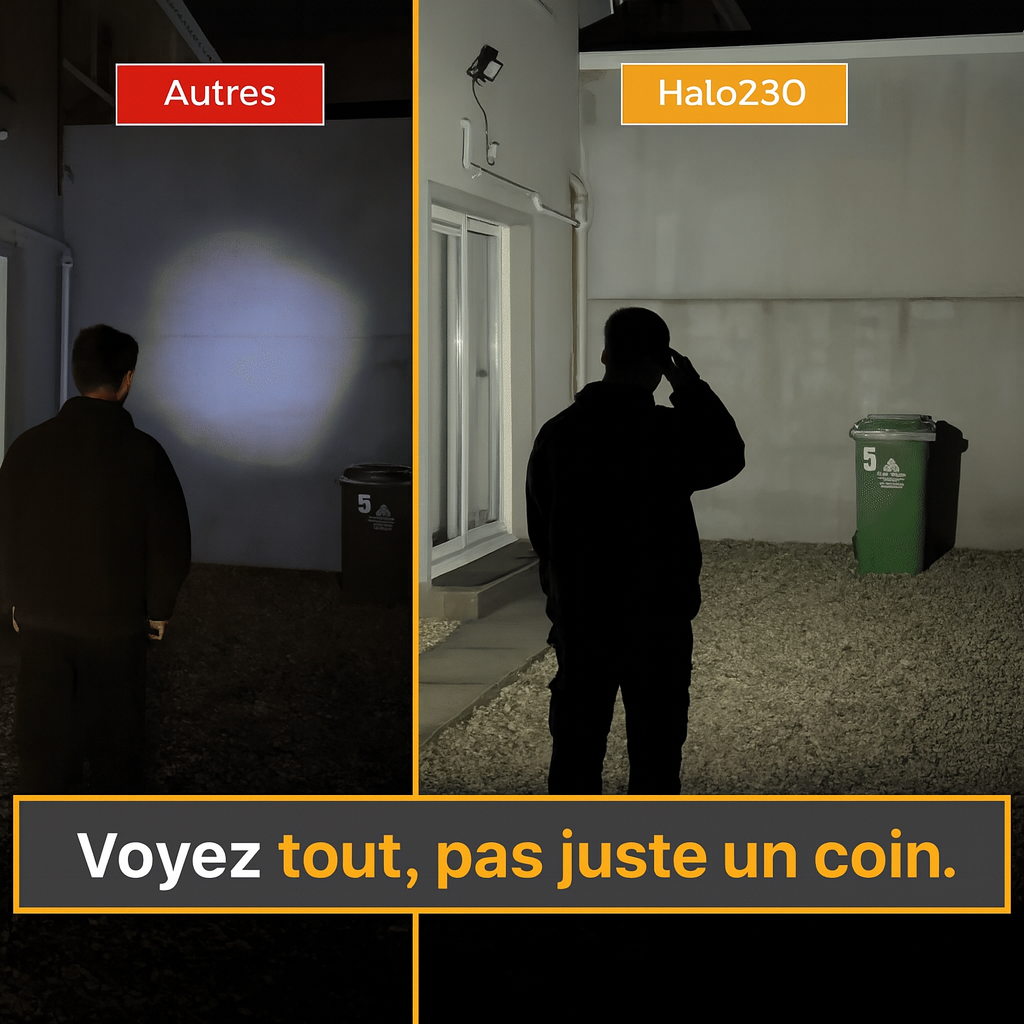 Observez comment le Halo230 éclaire tout le diamètre autour de vous comparé à une lampe frontale classique. (Faites glisser la barre orange pour voir la différence)